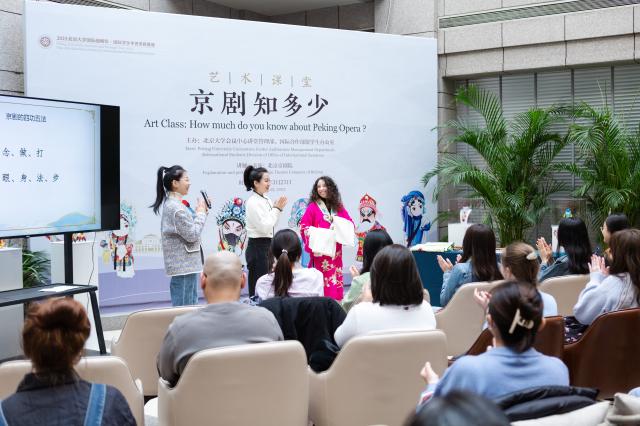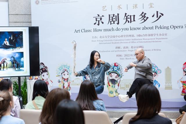 围绕学校“国际战略年”部署,百周年纪念讲堂与国际合作部加强合作,继续共建“国际学生学者美育基地”。本学期初,讲堂与来自多个国家的留学生代表座谈交流,了解他们对讲堂文化艺术活动需求。在此基础上,3月25日下午,讲堂与国际合作部留学生办公室联合策划推出艺术课堂“京剧知多少?”,特邀北京京剧院开展讲解表演,面向中外学生开放体验,展示中国传统京剧之美。