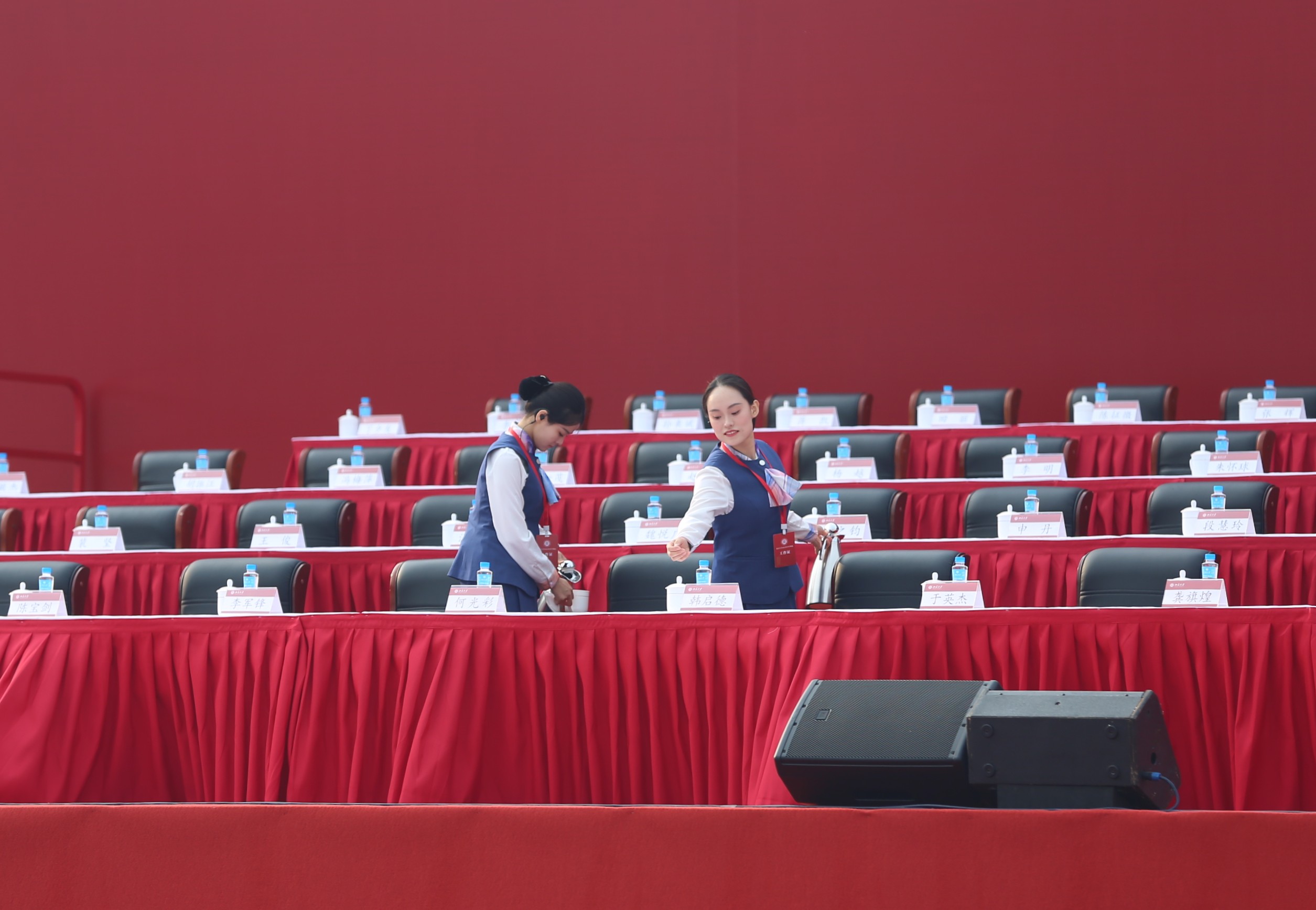 典礼当天,晨光微露,朝霞初染,对外交流中心工作团队于6:15抵达五四体育场就位,迅速投入典礼现场最后的优化工作中。现场,团队成员分工协作、默契配合,有序完成桌面布置、服务路线确认等环节;始终保持高度专注,灵活应对各类现场情况,以高度的责任感和专业的服务保障能力,确保各服务环节流畅。
