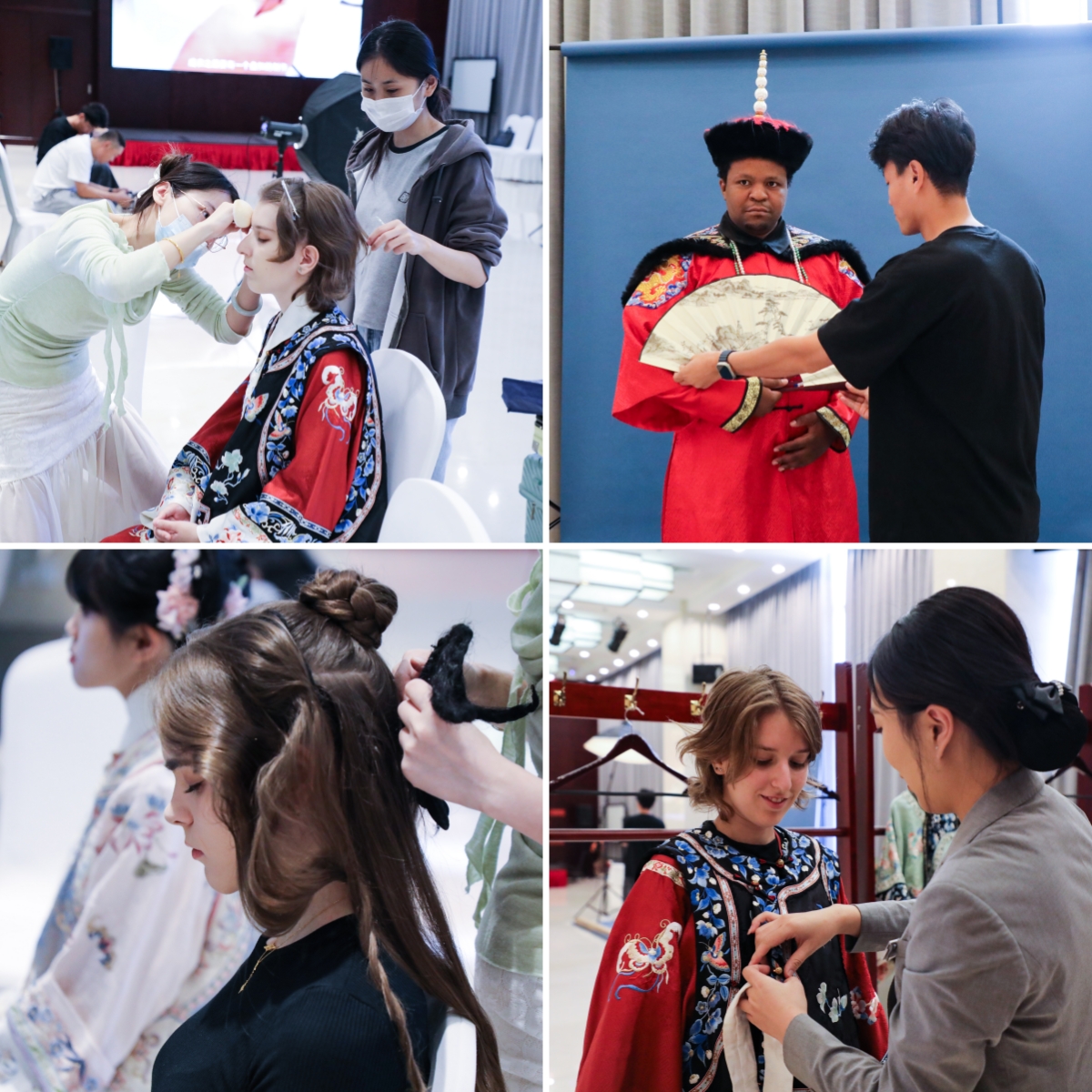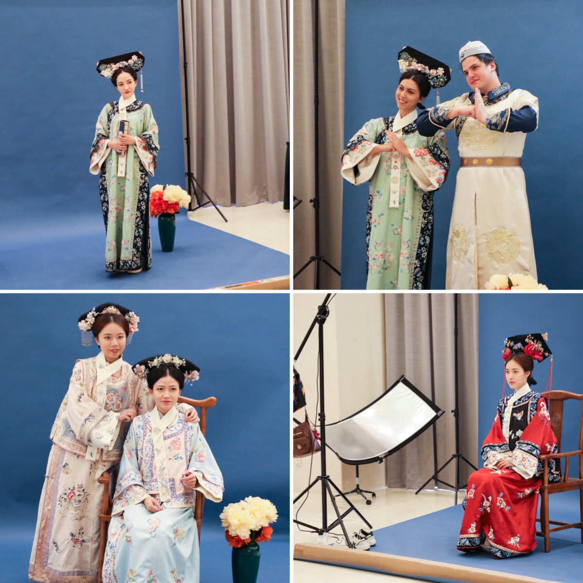 活动现场以中式花束与仿古家具营造古典氛围,留学生在专业指导下穿戴旗装,聆听文化讲解。拍摄时,或执扇凝眸,或抱拳行礼,尽显东方气韵与华夏礼仪风范。一位留学生赞叹:“穿上这身衣服,不由自主就会挺直脊背,放缓步伐,仿佛真的穿越了时空。”这一刻,旗装成为跨越语言的文化桥梁,让学子们在衣袂翩跹间,感悟“衣冠载道”的深厚文化内涵。
