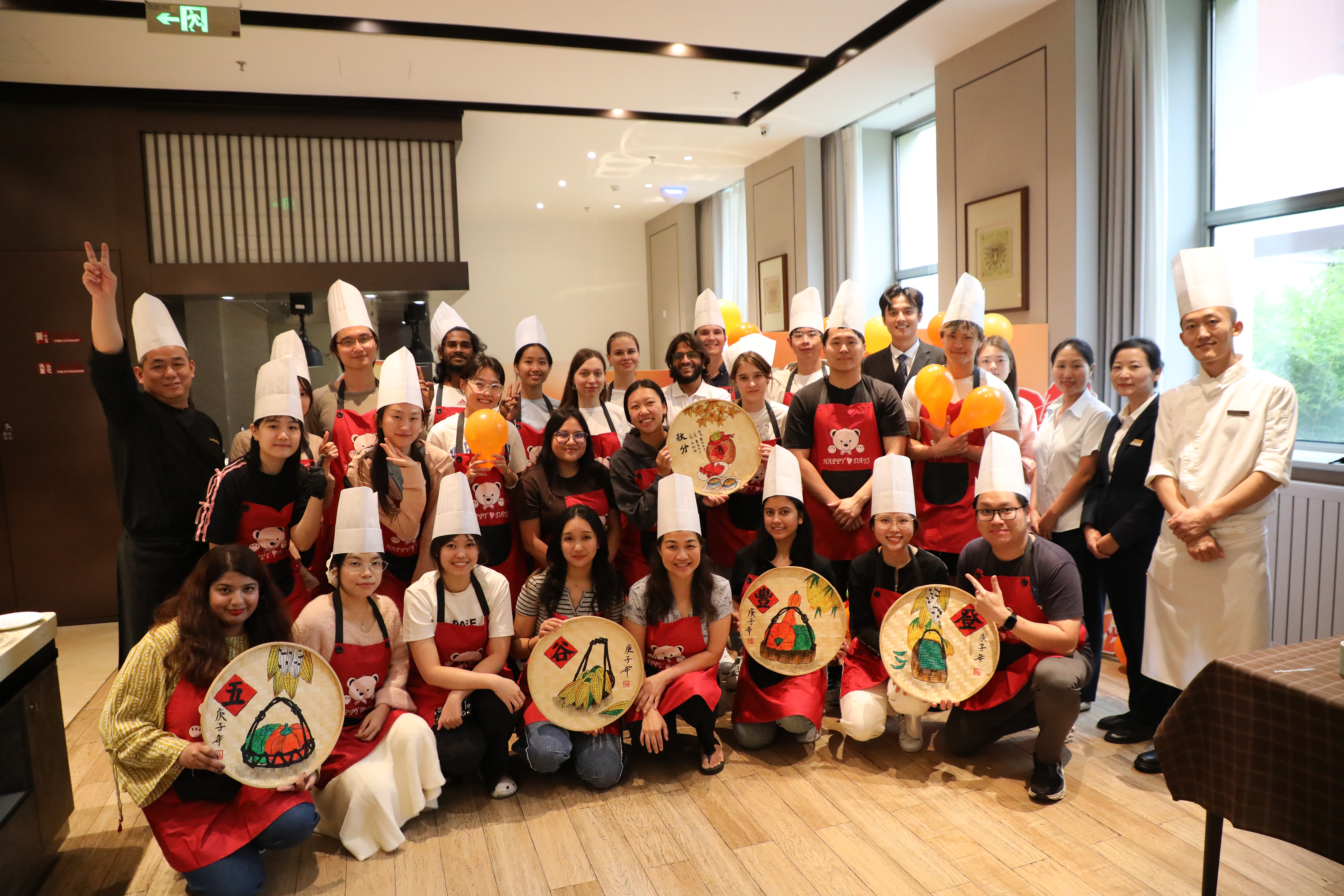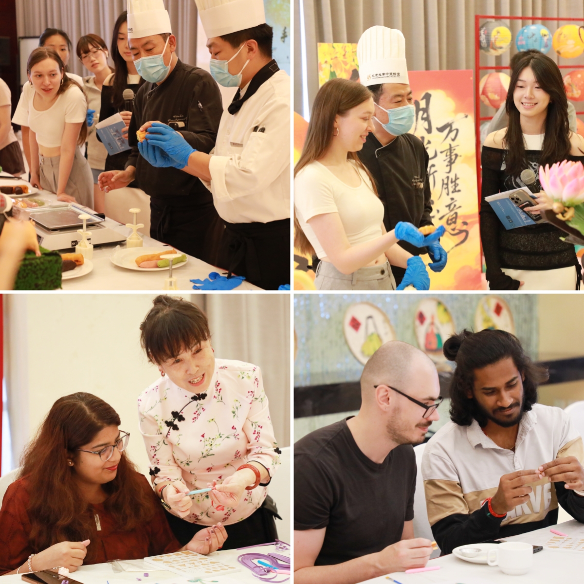 9月30日下午,中关新园1号楼集贤多功能厅内暖意融融,月饼DIY课堂温馨开课。留学生们在厨师团队的指导下,揉制面团、包裹馅料、压制成型,亲手制作出一枚枚纹样清晰、饱满圆润的月饼,节日甜香弥漫全场。